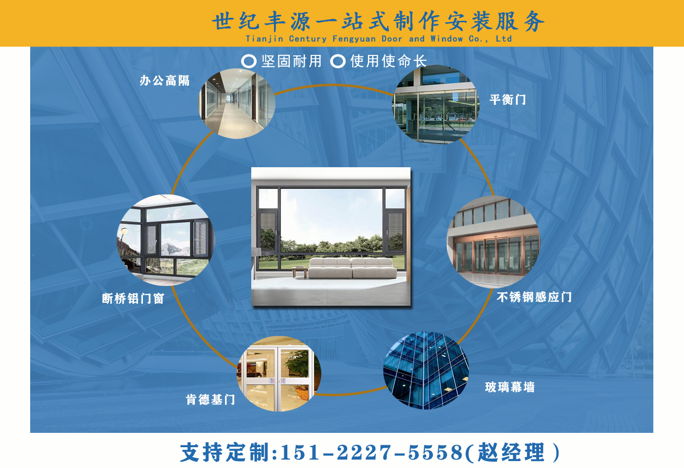 天津世紀豐源門窗有限公司從事斷橋鋁門窗,玻璃幕墻,平衡門,肯德基門,不銹鋼感應門,百葉窗,辦公高隔,制作安裝一站式訂制生產及配套服務等。  公司自成立以來,始終堅持以人才為本、誠信立業的經營原則,薈萃業界精英,成熟的技術、管理方法及企業經驗與國內企業的具體實際相結合,為企業供給各個方面的解決方案,使企業在激烈的市場競爭中始終堅持競爭力,實現企業快速、穩定地發展。  質量好、服務好、才能信譽好,公司已在諸多領域取得輝煌成績,愿意成為您可信賴的長期合作伙伴。  讓我們攜手同行,共同實現“讓普通老百姓都用得上高端門窗”...